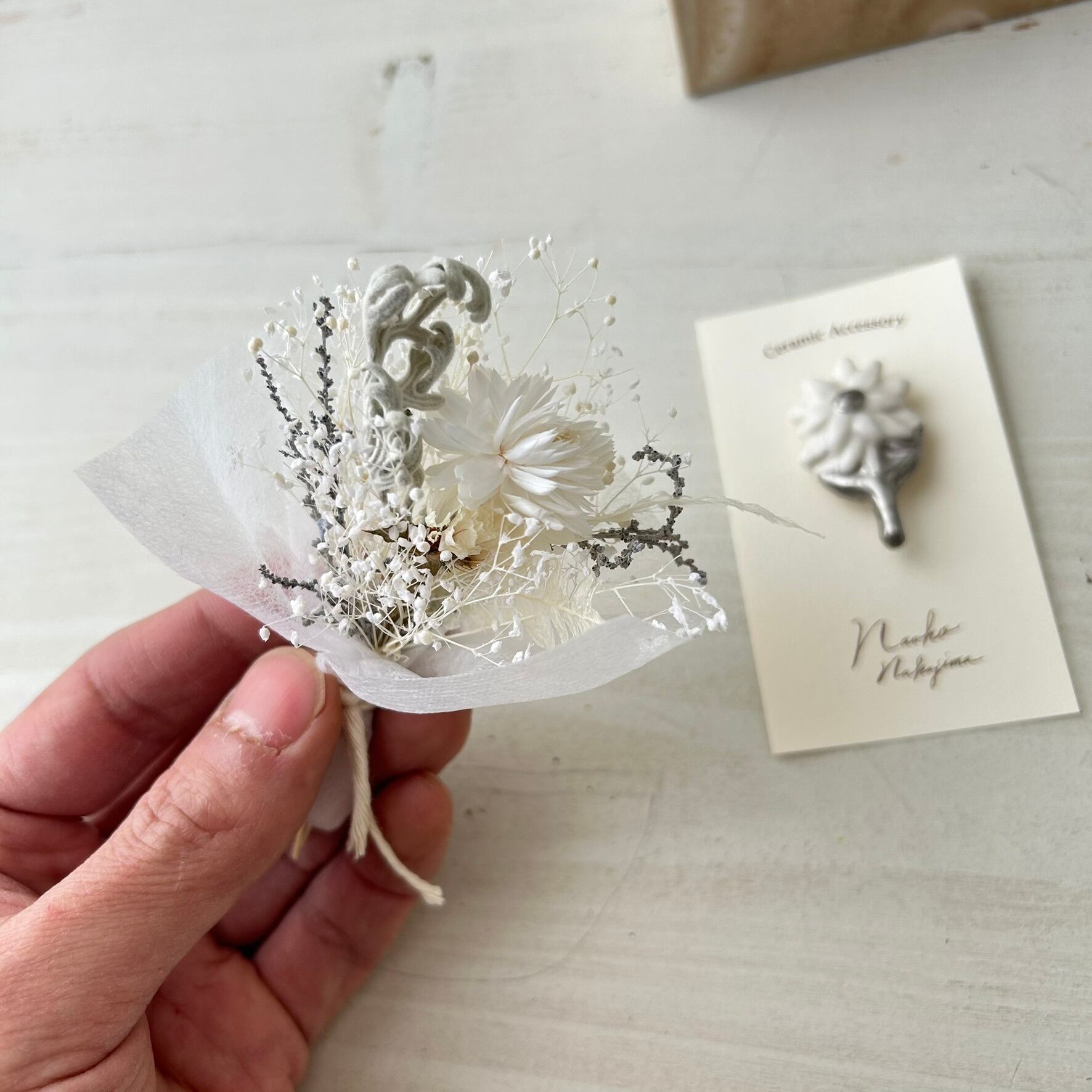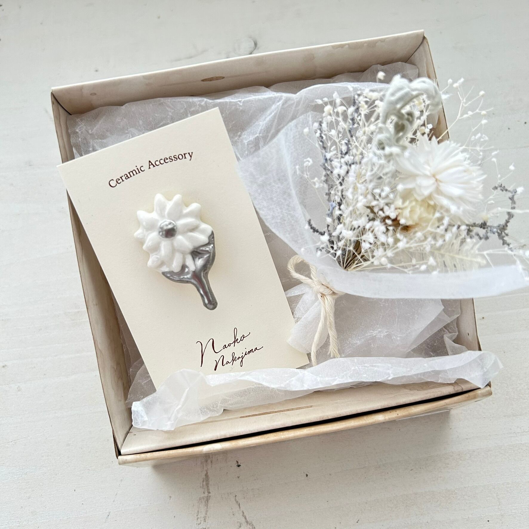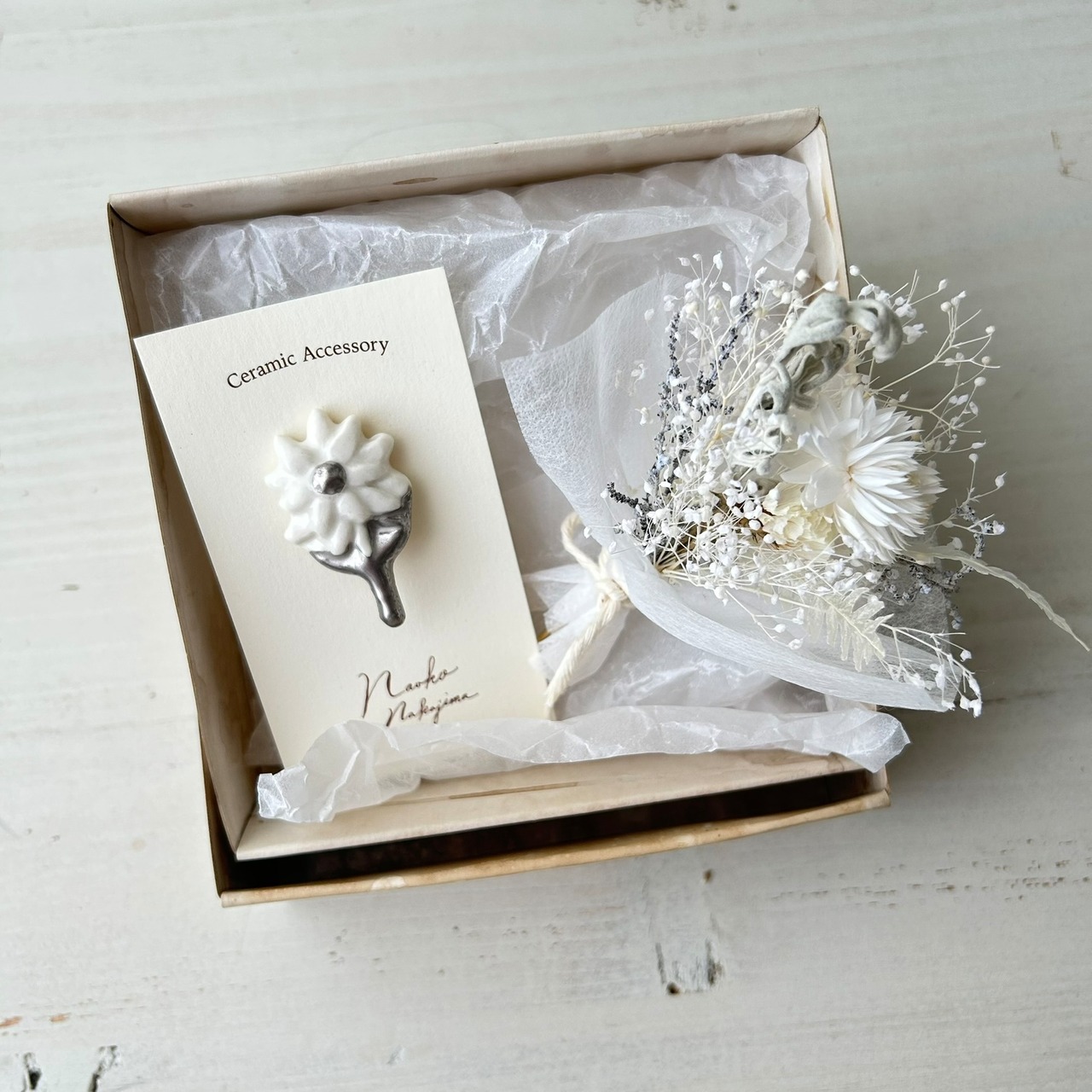 陶磁ブローチとミニミニブーケ ギフトセット エーデルワイス